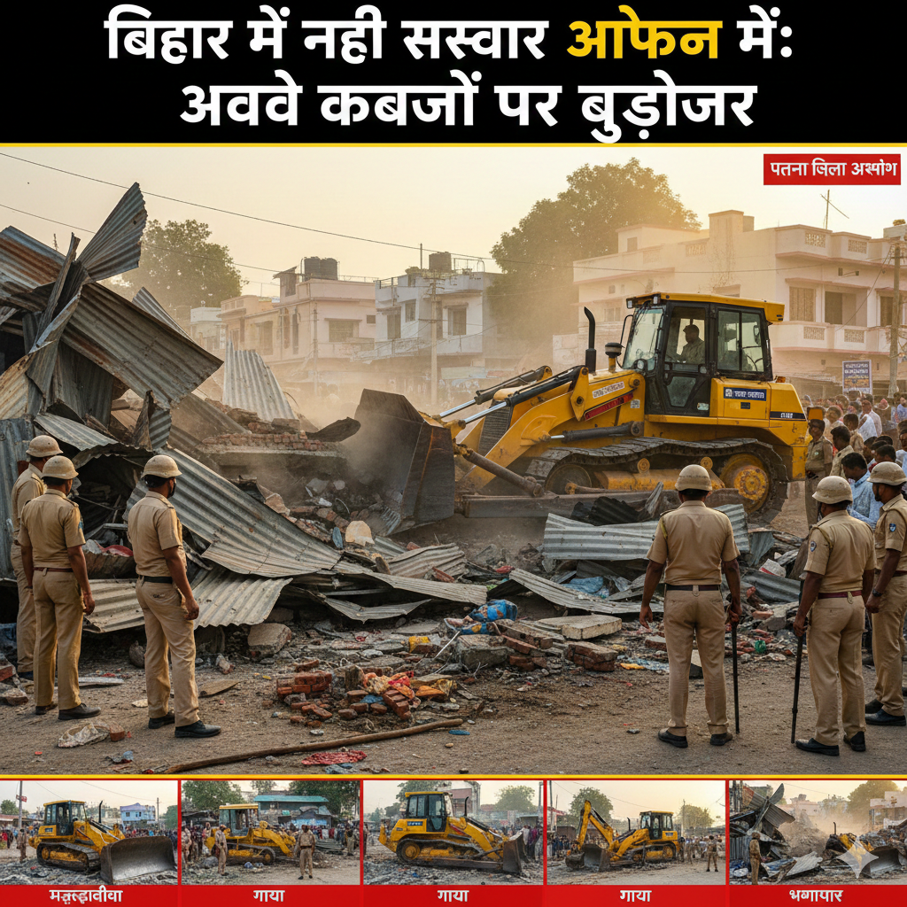 पटना, बिहार। बिहार में नई सरकार के गठन के तुरंत बाद प्रशासन एक्शन मोड में नजर आ रहा है। हाल ही में हुए मंत्रियों के विभाग आवंटन के बाद राज्यभर में अवैध कब्जों और अतिक्रमण के खिलाफ बड़े पैमाने पर बुलडोजर अभियान तेज कर दिया गया है। राजधानी पटना से लेकर कई जिलों में सरकारी जमीन, सड़क, नालों और सार्वजनिक स्थानों पर किए गए अवैध निर्माणों को ध्वस्त किया जा रहा है।